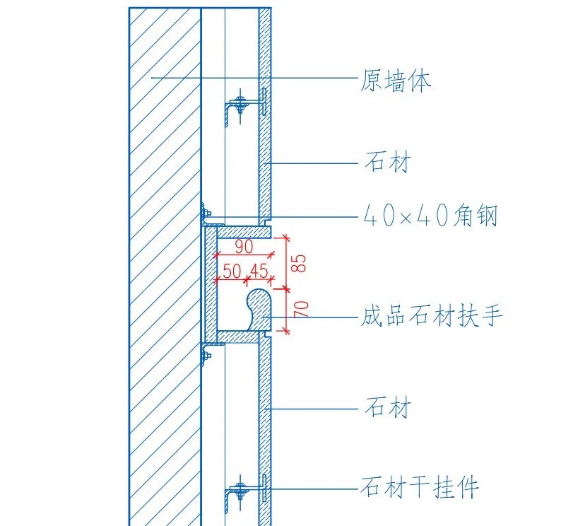 Install galvanized angle steel → Install stone dry hangers → Install stone → Install finished stone handrails.